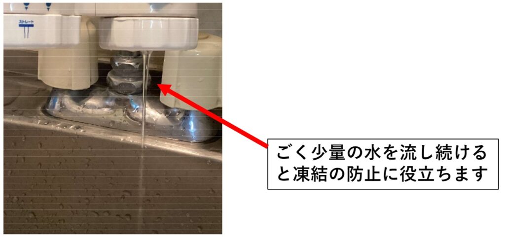 寒波などで氷点下になるときは、凍結による給水管の破裂を防ぐため、室内の蛇口からごく少量の水を出し続けることをお勧めします。